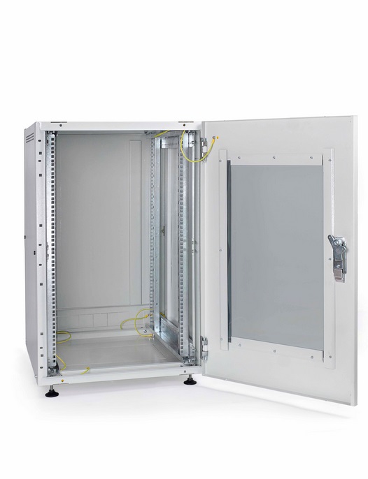 СЕРВЕРНА ШАФА С-24U-08-08-ДС-ПГ-1-7035 напольна призначена для встановлення 19” активного телекомунікаційного обладнання з подальшим обслуговуванням офісних і промислових об’єктів. Ступінь захисту шафи – IP30. Максимальне навантаження – 1000 кг. Телеком шафа дозволяє вирішувати практично будь-які завдання по розміщенню обладнання. Більше уваги було приділено фіксації і зміцненню монтажної стійки. За допомогою стійки обладнання можна регулювати по висоті і глибині. Доступ до монтажу обладнання здійснюється з 4-х сторін. Зручні знімні бічні панелі на петлях фіксуються замком, спрощують доступ до активного обладнання всередині шафи. Для кабельних вводів на задній частині шафи передбачена знімна панель, на якій знаходиться заглушка. Так само кабельні вводи знаходяться в кришці і на дні шафи і захищені так само заглушками. Вентиляція шафи забезпечується установкою блоків вентиляторів в дах або дно шафи і фіксується болтами. Для зняття статичного розряду всередині шафи конструкцією передбачені наявність клем заземлення на корпусі і дверях. Шафа поставляється в розібраному вигляді і легка у збірці.
