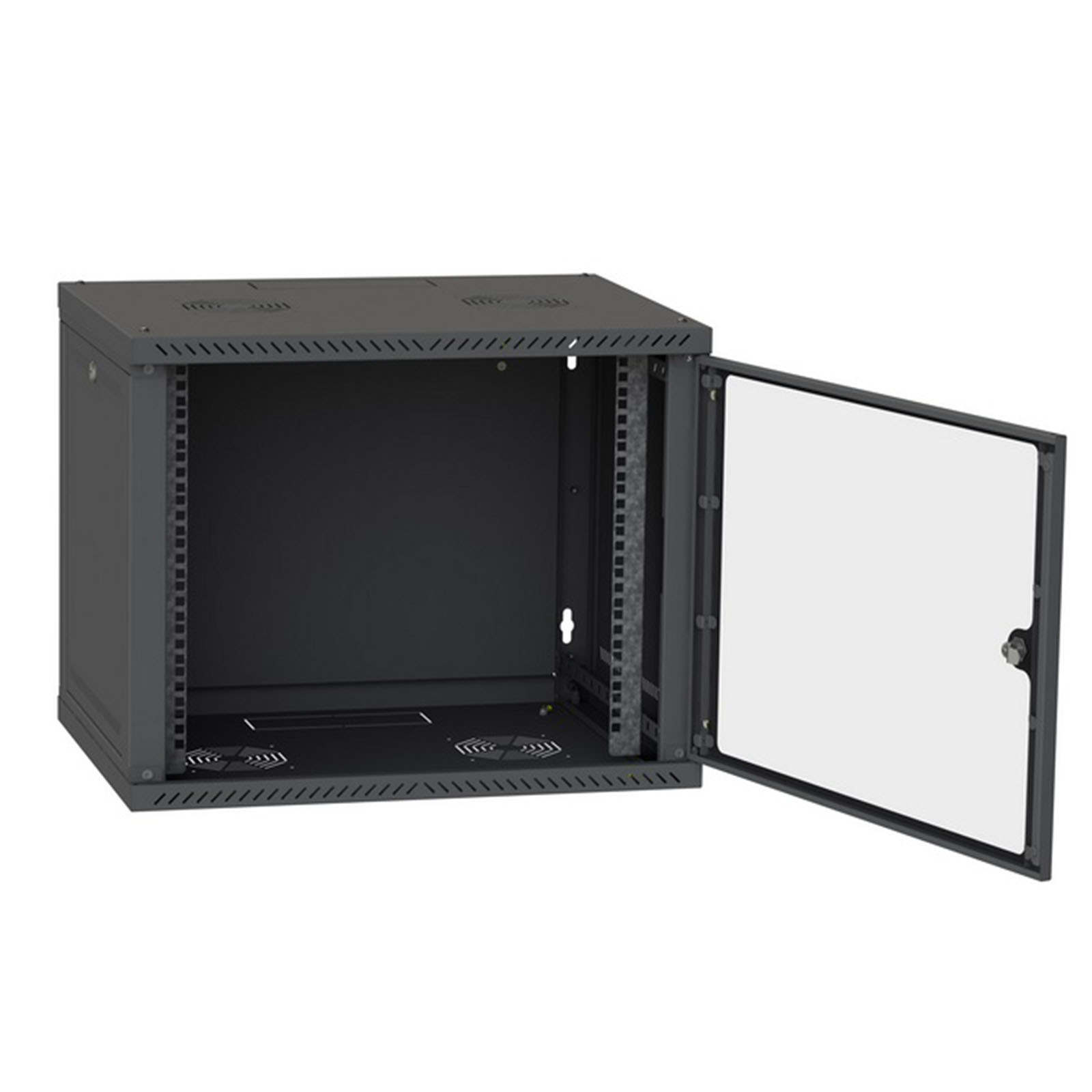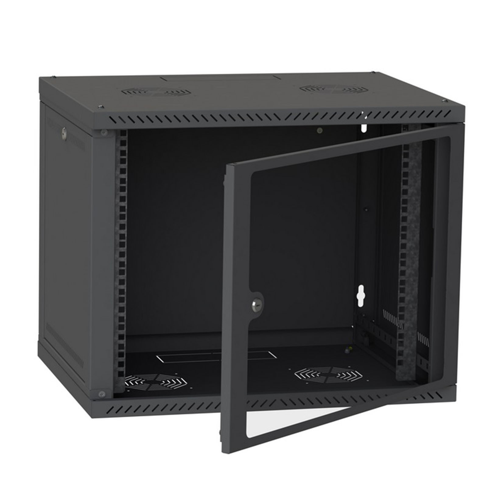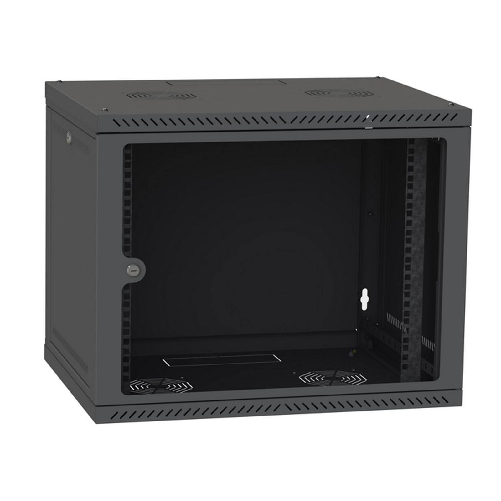 СЕРВЕРНА ШАФА 19″ Настінна СН-9U-060-045-ДC скло, чорна — якісна настінна серверна шафа, створена для ефективного розміщення 19-дюймового мережевого та серверного обладнання в компактних приміщеннях.